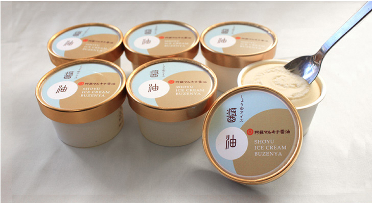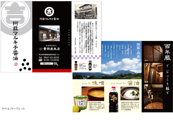 阿蘇・森の老舗しょうゆ・味噌の専門店「豊前屋本店」様のしょうゆアイスのラベルと、しおり・ギフトカタログ。